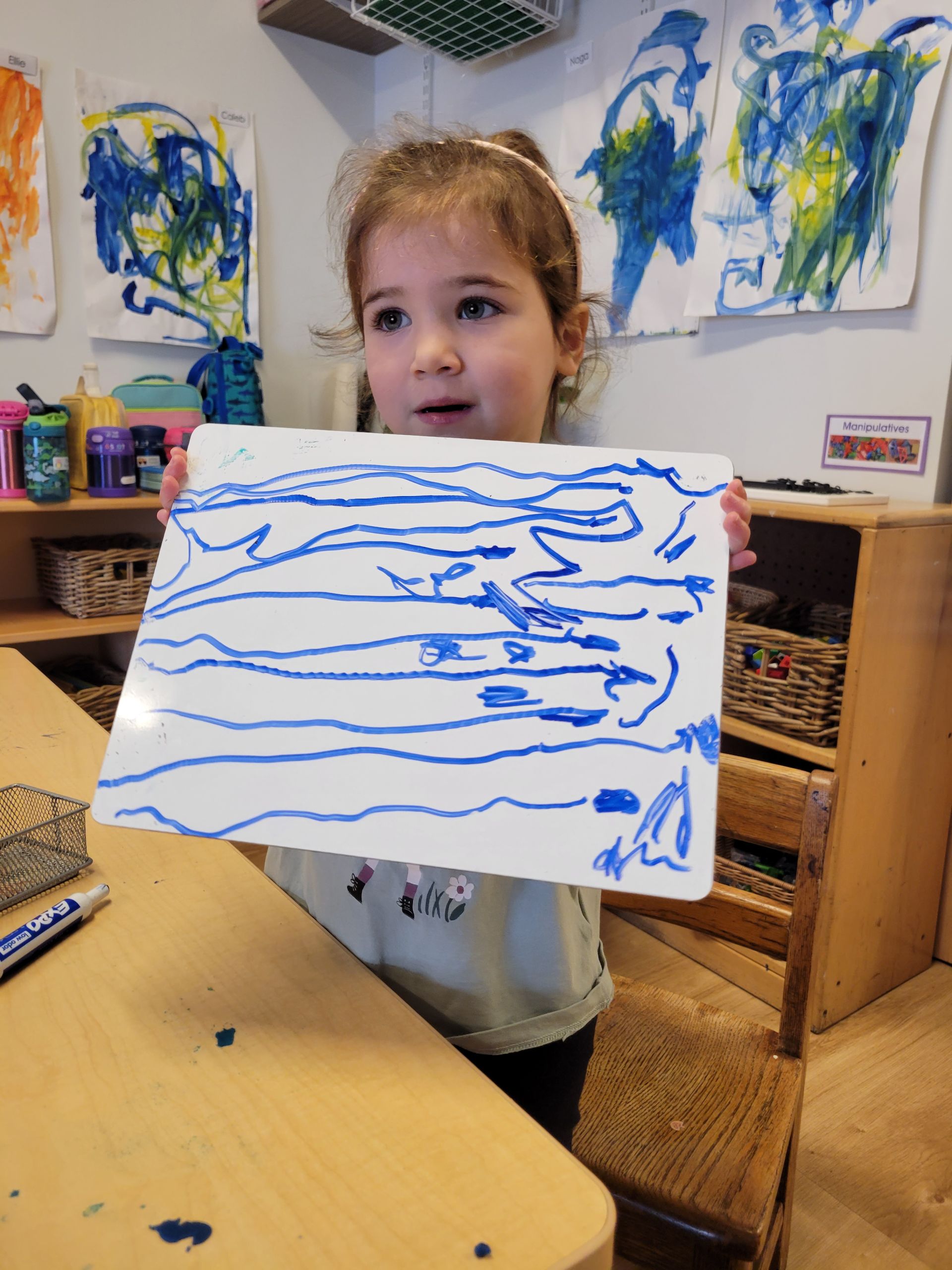 The materials in the classroom offer children the chance to engage in learning possibilities through the use of block building, painting and drawing, stories, science experiments and neighborhood walks.